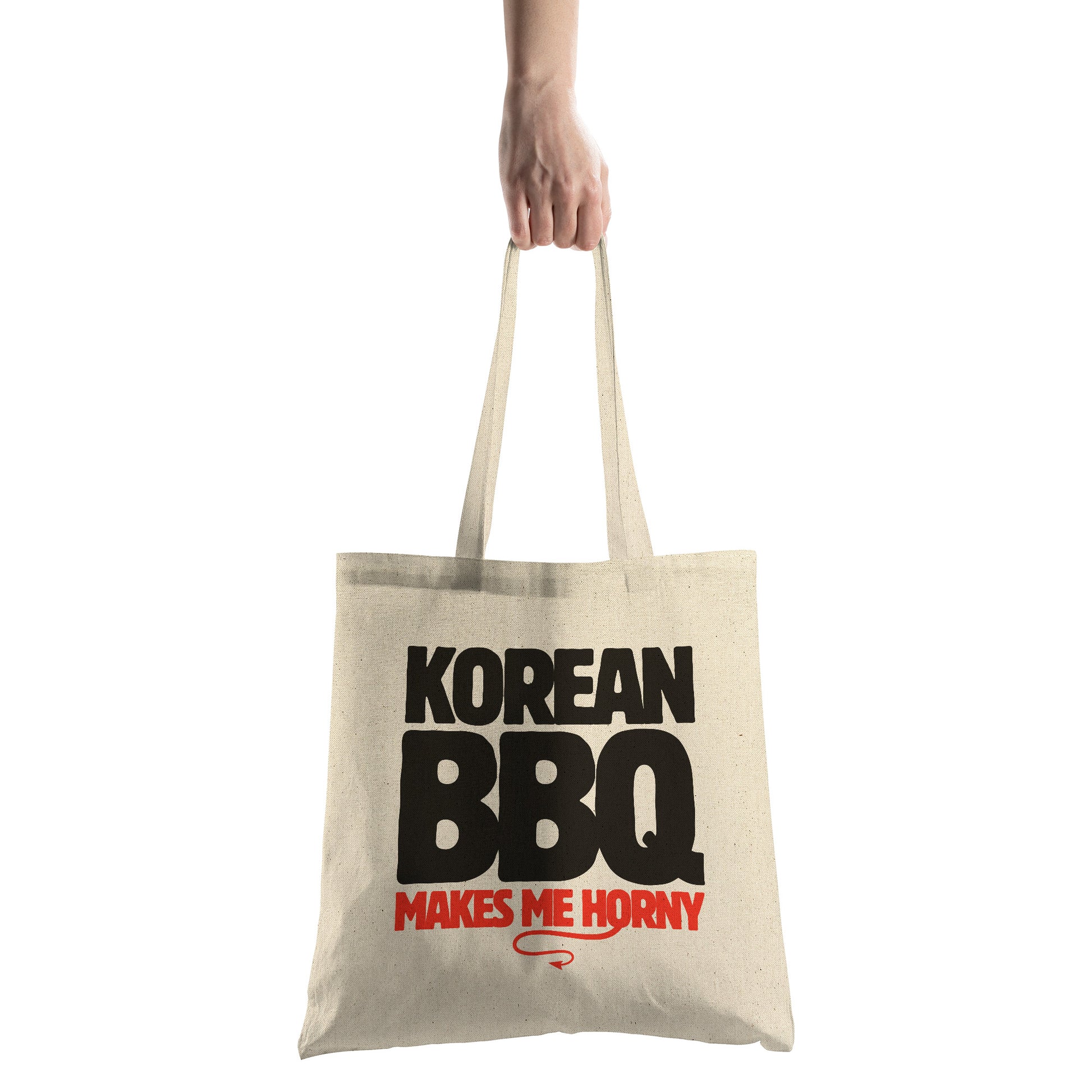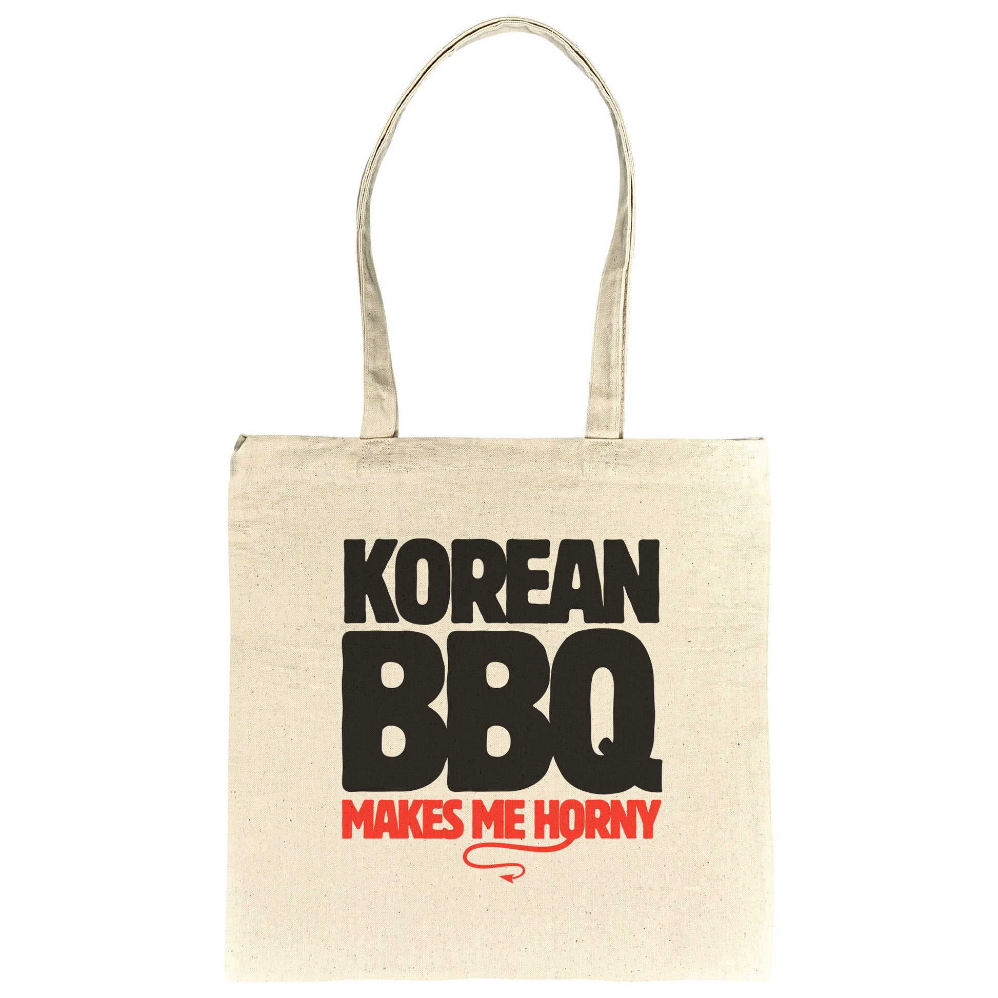 Our exclusive KOREAN BBQ MAKES ME HORNY bold graphic is printed on ONE side of your cotton tote.